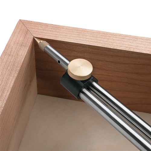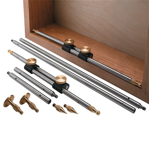 Three styles of tips are included: ball tips for inside measurements (the rounded ends avoid marring softwood), pointed tips for inside corner measurements and 13/16" diameter mushroom-shaped tips to hook over edges for outside measurements. The distance between the ends of the round or pointed tips is equal to the distance between the inside faces of the mushroom-shaped tips, letting you convert an inside measurement to an outside measurement just by switching tips. The clamp heads have large thumbscrews and slide easily for quick adjustment. The base unit adjusts from 7 1/2" to 12". Two pairs of extension rods are included, 4" and 12", allowing a span up to 44". For greater reach, additional 12" extension rods are available separately.