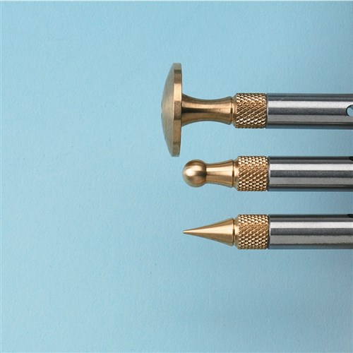 The base unit consists of two 6" steel rods fixed to aluminum clamp heads. The rods have threaded end holes that accept interchangeable brass tips or extension rods.