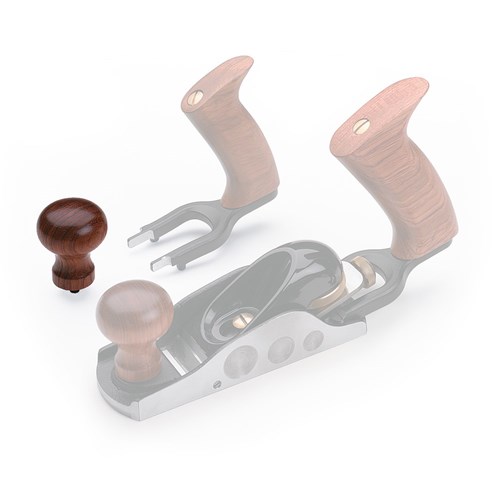 We offer inexpensive hardwood grips to adapt our low-angle block plane into a small bevel-up smoothing plane that can work a wide variety of woods, providing the firm hold and greater leverage needed to plane difficult wood. Retrofitted with this tall front knob and a vertical tote (available separately), the plane works similarly to a #3 smoothing plane for small-scale work, working in tight areas and for use by children or those with small hands or less strength.