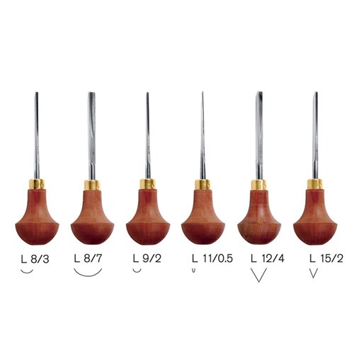 Palm chisels with Pear handles; ideal for small and detailed wood carving or lino print work. Tools are of the same high quality as all Pfeil carving tools; precisely ground and polished. Overall length 125mm. Blade length 70mm.
