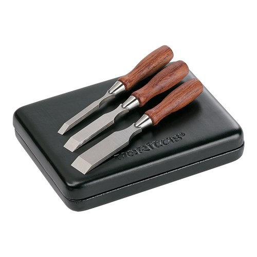 Their 3/32" thick PM-V11 steel blades are hardened to Rc61-63 and ground flat on the face. They have a 25° bevel. The chisel handles are hardwood with a stainless-steel ferrule.
