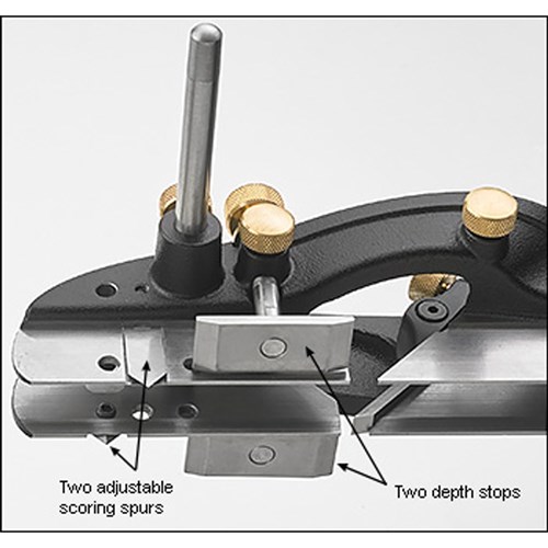 The Veritas® Combination Plane has a unique two part design, allowing it separate, accommodating different width blades, which makes grooves, or dados possible. A pair of scoring spur blades are used when cutting across the grain to prevent tearout, these blades sever the fibres, so allowing for the rabbet blades to remove the material in the middle cleanly.